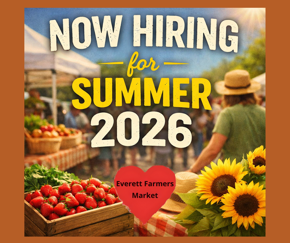 The Everett Farmers Market is seeking team members who are passionate about cultivating community and celebrating connection. Market Staff support market operations by assisting in set-up and teardown, providing excellent customer service to the community and vendors, and assist in other areas as needed. Ideal candidates have a desire to participate with others to advance ‘wholesome goodness,’ support local businesses, and play an integral role in the Everett Farmers Market community. There are varying positions and shifts available. For more information, please email the Everett Farmers Market team at: sandi.everettfarmersmarket@gmail.com.
